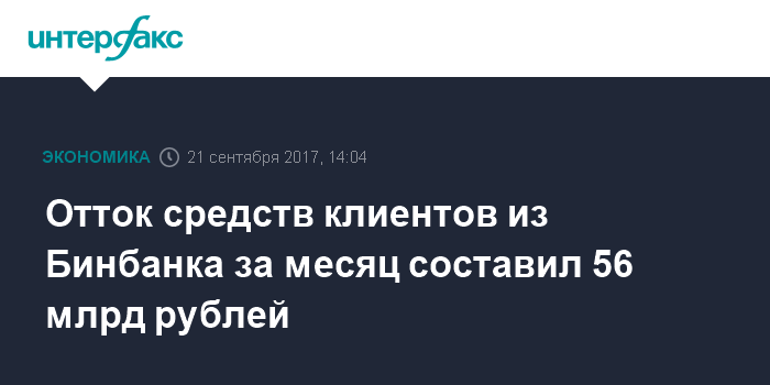 Москва. 21 сентября. INTERFAX.RU - Отток средств физлиц и юрлиц из Бинбанка в сентябре составил 56 млрд рублей, сообщил зампред ЦБ Василий Поздышев на пресс-конференции в четверг.