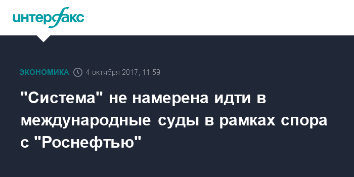 Москва. 4 октября. INTERFAX.RU - АФК "Система" не намерена прибегать к услугам международных судов для разрешения спорной ситуации с "Роснефтью", которая требует от компании 170,6 млрд рублей.