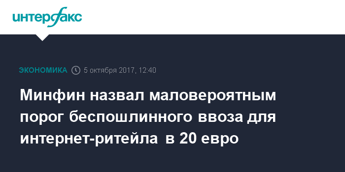 Правительство предложило снизить беспошлинный порог для интернет-покупок до 20 евроЧитать подробнееСазанов подчеркнул, что вариант снижения порога до 20 евро "наименее вероятен с точки зрения экономической логики и с точки зрения отношения к потребителю". "Порог имеет смысл, когда есть какие-то крупные посылки и высокие импортные пошлины, когда в совокупности НДС плюс импортная пошлина в каких-то ситуациях выводили бы на 30%-ную ставку. Поэтому опустить порог до 20 евро и ставку 30% - это избыточное налогообложение интернет-поставок", - сказал также он.