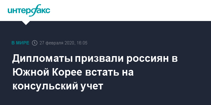 Москва. 27 февраля. INTERFAX.RU - Российское посольство в Республике Корея настоятельно рекомендовало согражданам, которые находятся в этой стране, встать на консульский учет в своих консульских округах, это позволит оперативно связаться с ними в случае экстренной эвакуации.