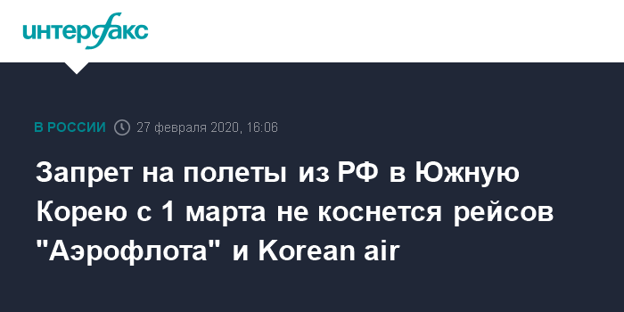 Москва. 27 февраля. INTERFAX.RU - Временный запрет на полеты из РФ в Южную Корею, который вводится с 1 марта, не коснется рейсов "Аэрофлота" и Korean air, сообщили в Минтрансе РФ.