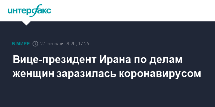 Москва. 27 февраля. INTERFAX.RU - Вице-президент Ирана по делам женщин и семьи Масуме Эбтекар стала самым высокопоставленным официальным лицом страны, заразившимся коронавирусом, сообщили в четверг иранские СМИ.
