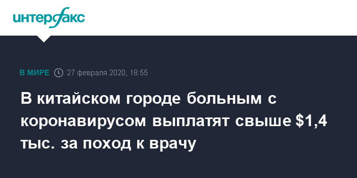 "Всех, кто придет с высокой температурой и пройдет обследование, но не получит подтверждения диагноза (коронавируса - ИФ), ждет вознаграждение в размере 1000 юаней ($143). Пациентов с подозрением на вирус - 2000 юаней ($285). В случае подтверждения коронавируса размер премии составит 10 000 юаней ($1426)" , - говорится в заявлении городских властей.