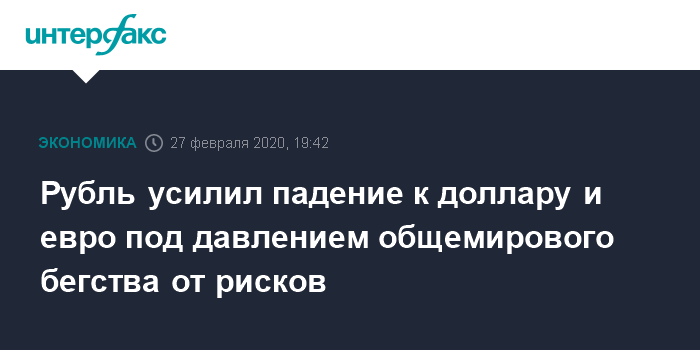 По мнению экспертов "Интерфакс-ЦЭА", рубль заметно снижается к доллару и евро в ходе вечерних торгов четверга вслед за большинством валют emerging markets, дешевеющих на опасениях относительно распространения коронавируса за пределами Китая, а также из-за продолжающегося падения нефтяных цен. Фондовые индексы также продолжают снижаться - общемировой фондовый индекс MSCI All-Country World опускается шестую сессию подряд и находится на минимальном уровне с октября. Падение американского индекса S&P 500 за последние шесть дней превысило 10%, значение Dow Industrial Average опустилось на 10% ниже своего максимального уровня.