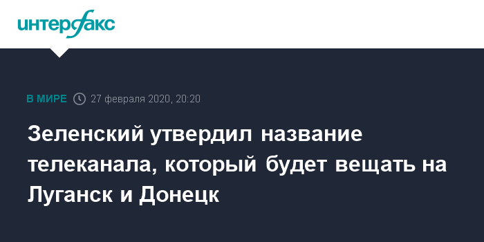 Москва. 27 февраля. INTERFAX.RU - Телеканал для неподконтрольных Киеву территорий, запуск вещания которого анонсировали на 1 марта 2020 года, будет называться "Дом", сообщает интернет-издание "Детектор медиа" со ссылкой на три разных источника.