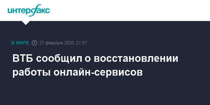 Москва. 27 февраля. INTERFAX.RU - ВТБ сообщил, что полностью восстановил работоспособность IT-систем после многочасового сбоя.