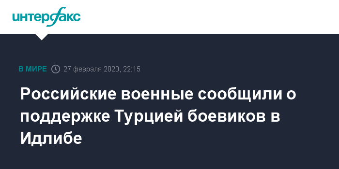 Москва. 27 февраля. INTERFAX.RU - Турция помогает боевикам в Идлибской зоне деэскалации ударами артиллерии и работой беспилотников, заявили российские военные.
