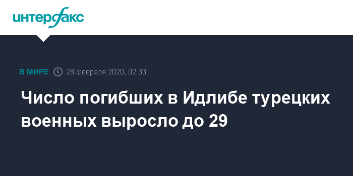 Москва. 28 февраля. INTERFAX.RU - Сирийский авиаудар в Идлибе привёл к гибели 29 турецких военных, заявили журналистам власти турецкой приграничной провинции Хатай.