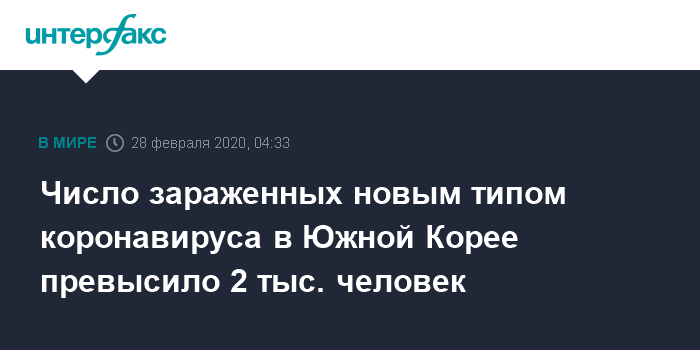 Число зараженных новым типом коронавируса в Южной Корее превысило 2 тыс. человек