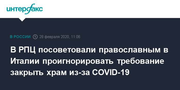 Москва. 28 февраля. INTERFAX.RU - У прихожан РПЦ в Италии есть право не подчиняться требованию местных властей закрыть храм из-за коронавируса, заявил в эфире телеканала "Спас" глава патриаршей комиссии по делам семьи протоиерей Димитрий Смирнов.