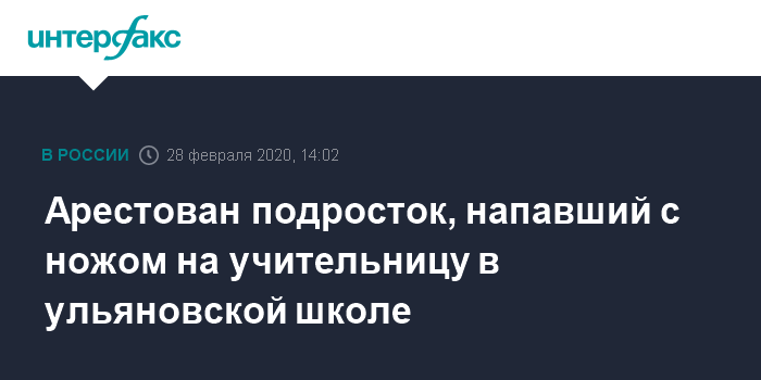 26 февраля во время урока восьмиклассник ударил ножом 59-летнюю учительницу алгебры и геометрии школы N81 Ульяновска. Пострадавшая была госпитализирована. Подростка задержали уже дома, полиция отмечала, что на учете он не состоял.