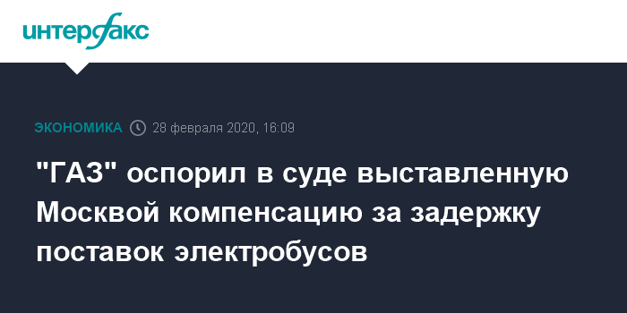 Москва. 28 февраля. INTERFAX.RU - Арбитражный суд Москвы зарегистрировал иск автобусного подразделения группы "ГАЗ" (ООО "Русские автобусы - Группа ГАЗ") к столичному оператору транспорта ГУП "Мосгортранс" на 1,1 млрд рублей - компания оспаривает сумму выставленной компенсации за задержку поставок городу первой партии электробусов, которая произошла из-за санкционных проблем.