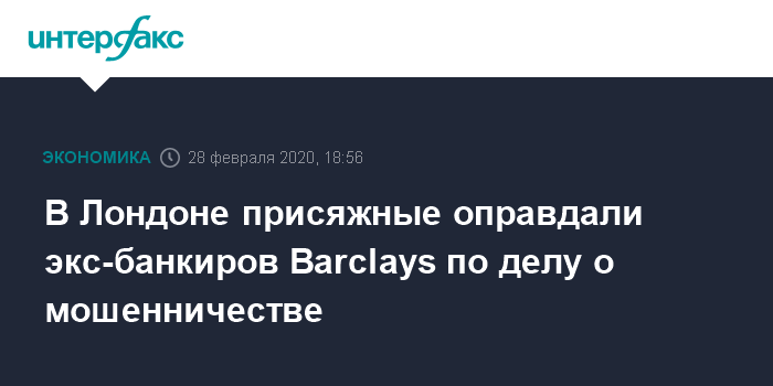 Москва. 28 февраля. INTERFAX.RU - Лондонский суд присяжных оправдал троих бывших топ-менеджеров британского банка Barclays Plc - Роджера Дженкинса, Томаса Калариса и Ричарда Боата, обвинявшихся в мошенничестве при проведении сделок с Катаром в разгар финансового кризиса.