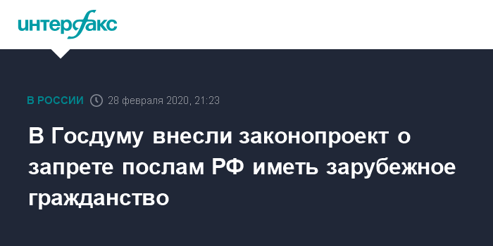 Москва. 28 февраля. INTERFAX.RU - В Госдуму поступил законопроект, запрещающий претендентам на должность посла и спецпредставителя РФ иметь гражданство или вид на жительство иностранного государства.