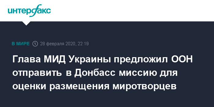 Москва. 28 февраля. INTERFAX.RU - Министр иностранных дел Украины Вадим Пристайко сообщил, что во время визита в США он обратился к руководству ООН с просьбой прислать на Украину миссию, которая оценит возможность размещения на Донбассе миротворческой миссии ООН.