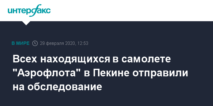 Москва. 29 февраля. INTERFAX.RU - На борту самолета авиакомпании "Аэрофлот", следовавшего рейсом SU204 из Москвы в Пекин, был выявлен пассажир с подозрением на коронавирус, информирует в субботу посольство России в Китае.