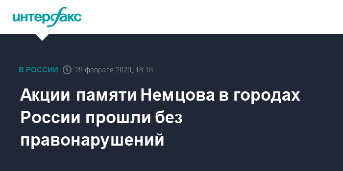 Москва. 29 февраля. INTERFAX.RU - Правоохранительные органы не зафиксировали правонарушений во время проведения в субботу маршей памяти оппозиционного политика, бывшего первого вице-премьера РФ Бориса Немцова в разных городах России.