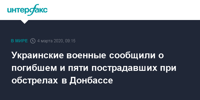 Москва. 4 марта. INTERFAX.RU - За 3 марта в Донбассе погиб один украинский военный и еще пятеро были ранены в результате обстрелов со стороны сепаратистов, за сутки обстрелов было семь, сообщил штаб операции Объединенных сил.