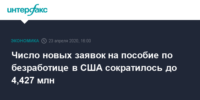 Москва. 23 апреля. INTERFAX.RU - Количество американцев, впервые обратившихся за пособием по безработице, на прошлой неделе сократилось до 4,427 млн, говорится в отчете министерства труда США.