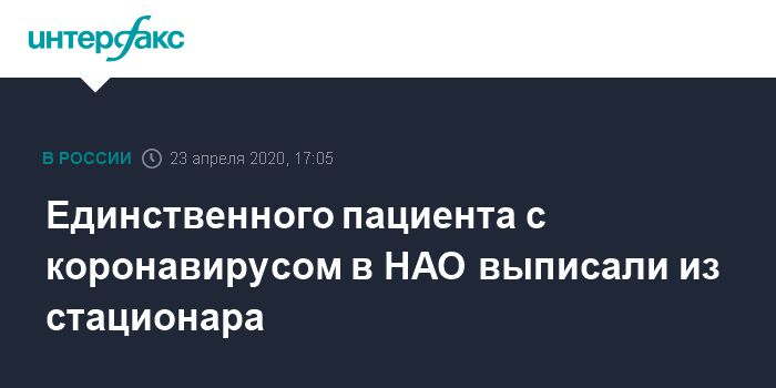 Москва. 23 апреля. INTERFAX.RU - Единственного в Ненецком автономном округе пациента, получавшего лечение от коронавирусной инфекции, в четверг выписали из стационара, сообщили "Интерфаксу" в пресс-службе администрации НАО.