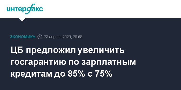Москва. 23 апреля. INTERFAX.RU - Центробанк РФ предложил правительству увеличить обеспечение, которое через ВЭБ предоставляется банкам на зарплатные кредиты, до 85% с нынешнего уровня 75%. об этом рассказал "Интерфаксу" источник в финансово-экономическом блоке правительства.
