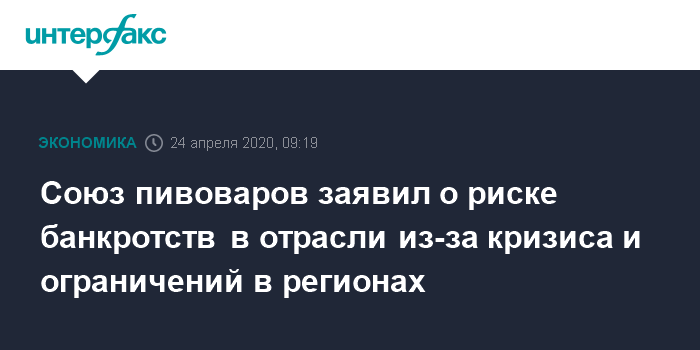 Москва. 24 апреля. INTERFAX.RU - Союз российских производителей пивобезалкогольной продукции (Союз пивоваров) предупредил о риске банкротств из-за кризиса и дополнительных ограничений, которые вводятся в регионах в рамках борьбы с распространением в России коронавируса.