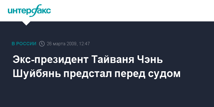 Москва. 26 марта. INTERFAX.RU – Судебный процесс над бывшим президентом Тайваня Чэнь Шуйбянем начался в четверг в Тайбэе.