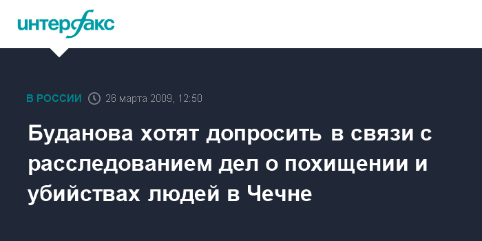Москва. 26 марта. INTERFAX.RU - СКП РФ планирует допросить бывшего полковника российской армии Юрия Буданова в рамках расследования уголовных дел о похищении и убийстве жителей Чечни.