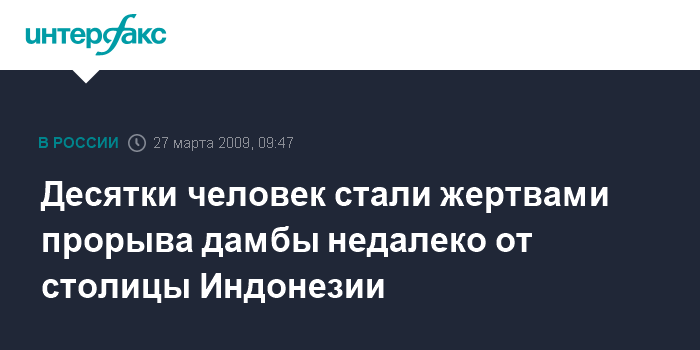 Москва. 27 марта. INTERFAX.RU - Несколько десятков человек погибли в ночь на пятницу в результате прорыва дамбы юго-западнее индонезийской столицы Джакарты, сообщает британская телерадиокорпорация ВВС.
