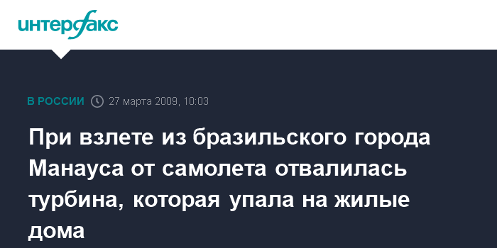 Москва. 27 марта. INTERFAX.RU - Американский самолет "Ди-Си-10" в ночь на пятницу "потерял" турбину в момент взлета из международного аэропорта имени Эдуарду Гомиса в Манаусе, столице бразильского штата Амазонас.