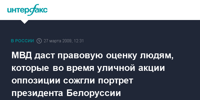 Москва. 27 марта. INTERFAX.RU - Министр внутренних дел Белоруссии генерал-лейтенант милиции Владимир Наумов обещает, что будет дана правовая оценка действиям людей, которые 25 марта нынешнего года во время уличной акции оппозиции сожгли портрет президента Белоруссии.