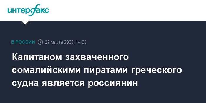 Москва. 27 марта. INTERFAX.RU - Посольство России в Греции подтвердило, что капитаном греческого судна, захваченного пиратами у берегов Сомали, является гражданин России.