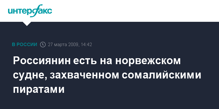 Москва. 27 марта. INTERFAX.RU - Посольство России в Норвегии имеет сведения об одном гражданине России, который находился на норвежском судне, захваченном накануне пиратами у берегов Сомали.