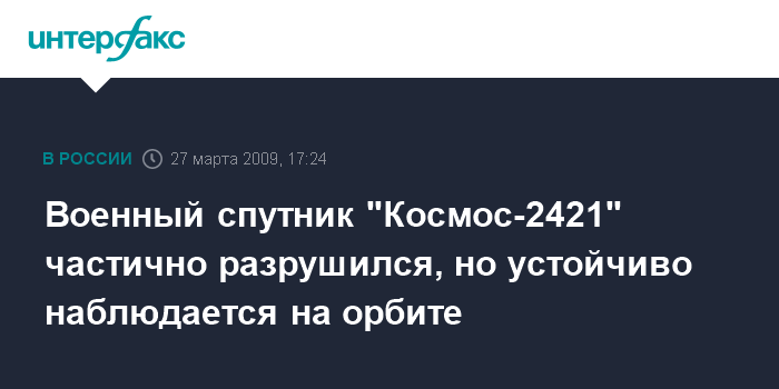 Москва. 27 марта. INTERFAX.RU - Космический аппарат военного назначения "Космос-2421" в феврале после отключения бортовой аппаратуры был выведен из эксплуатации и переведен в категорию недействующих космических аппаратов, сообщает в пятницу служба информации Космических войск.