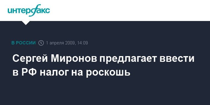 Москва. 1 апреля. INTERFAX.RU - Спикер Совета Федерации, лидер партии "Справедливая Россия" Сергей Миронов считает целесообразным в условиях кризиса введение налога на роскошь.