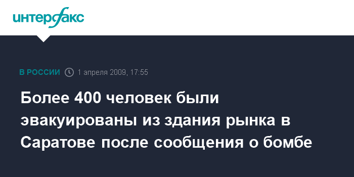 Москва. 1 апреля. INTERFAX.RU - В Саратове неизвестный сообщил, что в районе Сенного рынка заложена бомба, в результате более 400 человек были эвакуированы.