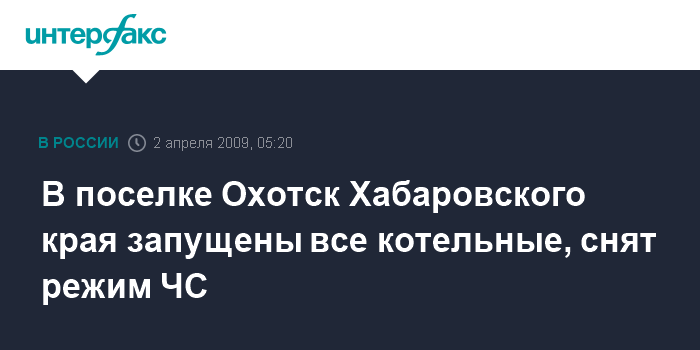 Хабаровск. 2 апреля. ИНТЕРФАКС-ДАЛЬНИЙ ВОСТОК - Комиссия по чрезвычайным ситуациям, созданная для ликвидации последствий мощного снегопада, в результате чего жители северного поселка Охотск в Хабаровском крае остались без теплоснабжения, приняла решение отменить режим ЧС.