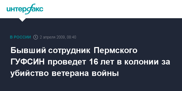 Москва. 2 апреля. INTERFAX.RU - Пермский краевой суд приговорил к 16 годам в колонии строгого режима бывшего сотрудника ГУФСИН по Пермскому краю Андрея Демидика, признав его виновным в убийстве ветерана Великой Отечественной войны.