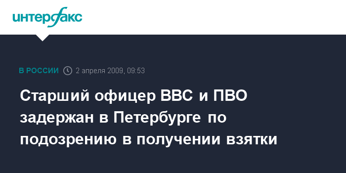 Москва. 2 апреля. INTERFAX.RU - В Санкт-Петербурге в рамках мероприятий по противодействию коррупционным проявлениям в вооруженных силах военной прокуратурой Ленинградского военного округа совместно с сотрудниками ГУВД по Петербургу и Ленинградской области задержан старший офицер ВВС и ПВО.