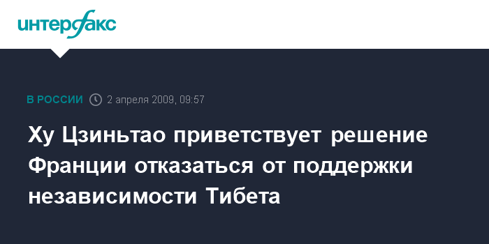 Ху Цзиньтао приветствует решение Франции отказаться от поддержки независимости Тибета