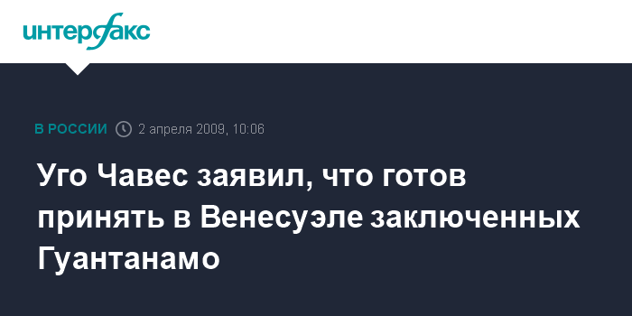 Москва. 2 апреля. INTERFAX.RU - Президент Венесуэлы Уго Чавес заявил, что может принять в своей стране заключенных, содержащихся в центре задержаний на американской военной базе Гуантанамо, сообщила в четверг британская телерадиокорпорация Би-Би-Си.
