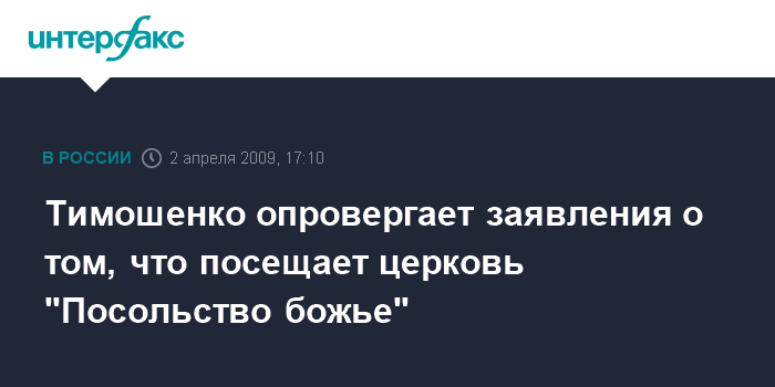 Киев. 2 апреля. INTERFAX.RU - Премьер-министр Украины Юлия Тимошенко опровергает заявления мэра Киева Леонида Черновецкого о том, что она якобы является прихожанкой церкви "Посольство божье".