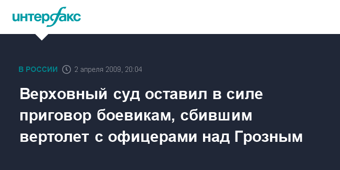 Москва. 2 апреля. INTERFAX.RU - Верховный суд РФ признал законным осуждение на пожизненный срок боевиков, обвиняемых в совершении теракта, в результате которого в 2001 году в Грозном был сбит вертолет с офицерами Генштаба Минобороны РФ, сообщил адвокат одного из обвиняемых Мурад Мусаев.
