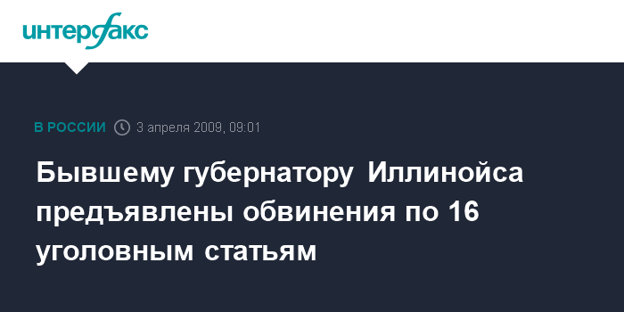 Москва. 3 апреля. INTERFAX.RU - Официальные обвинения по 16 федеральным уголовным статьям предъявлены бывшему губернатору американского штата Иллинойс Роду Благоевичу, сообщает американская телекомпания Си-Эн-Эн.