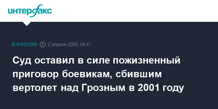 Москва. 3 апреля. INTERFAX.RU - Верховный суд РФ признал законным осуждение на пожизненный срок боевиков, обвиняемых в совершении теракта, в результате которого в 2001 году в Грозном был сбит вертолет с офицерами Генштаба Минобороны РФ, сообщил адвокат одного из обвиняемых Мурад Мусаев.