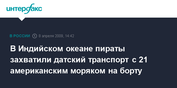 Москва. 8 апреля. INTERFAX.RU - Сомалийские пираты в среду захватили датский сухогруз, управляемый одним из пароходств США. На борту судна находится экипаж из 21 человека, все они граждане США, сообщила британская телекомпания Sky News. Сухогруз водоизмещением 17 тыс. тонн был захвачен в Индийском океане в 400 милях от столицы Сомали города Могадишу.