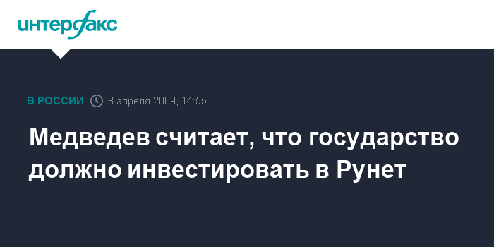 Медведев подчеркнул, что и само государство должно осуществлять инвестиции в этой сфере. Он напомнил, что "некоторое время назад интернет-активы стали быстро расти в цене". "Еще несколько лет назад наш бизнес считал, что весь российский Интернет стоит около $200 миллионов. Но потом наступила эпоха быстрого развития и завышенных ожиданий. В результате, до кризиса стоимость активов была около $5 млрд, может быть, даже больше. Сейчас, конечно, эта стоимость упала. Но это не значит, что этому процессу не следует уделять внимание", - отметил глава государства.