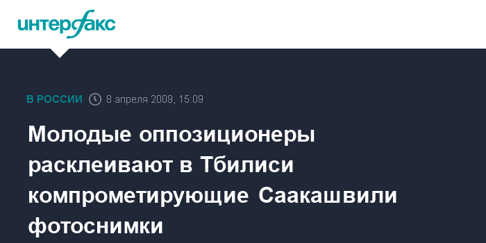 Москва. 8 апреля. INTERFAX.RU - Несколько десятков членов молодежных организаций оппозиционных партий в среду обклеили стены зданий, прилегающих к станции метрополитена "Свобода" на центральном проспекте Руставели снимками президента Михаила Саакашвили, компрометирующими его. На снимках, сделанных в августе прошлого года, - Михаил Саакашвили, жующий свой галстук и прячущийся на земле за телами охранников в Гори.