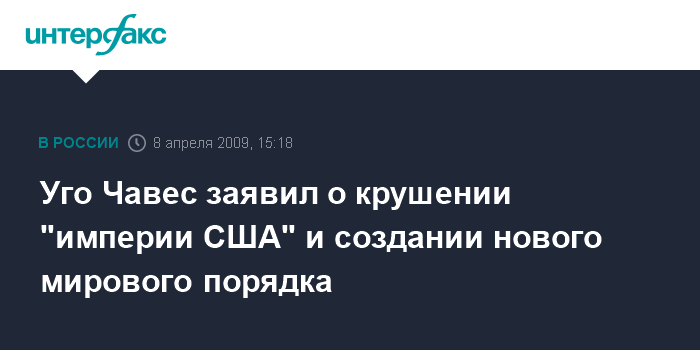Москва. 8 апреля. INTERFAX.RU - Президент Венесуэлы Уго Чавес, в настоящее время находящийся с визитом в Китае, заявил, что его поездка является частью создания "нового мирового порядка" в связи с "крушением империи США".