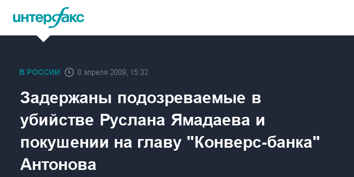 Москва. 8 апреля. INTERFAX.RU - Подозреваемые в совершении ряда громких преступлений, в том числе убийства Героя России Руслана Ямадаева и покушении на убийство главы "Конверс-Банка" Александра Антонова, задержаны.